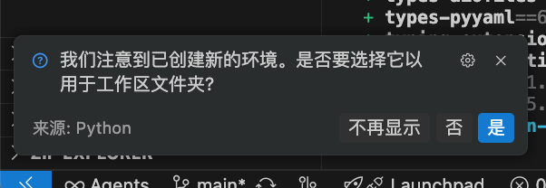 此时,uv 将自动为您创建虚拟环境(.venv),若您的编辑器询问您是否使用此虚拟环境,请选择